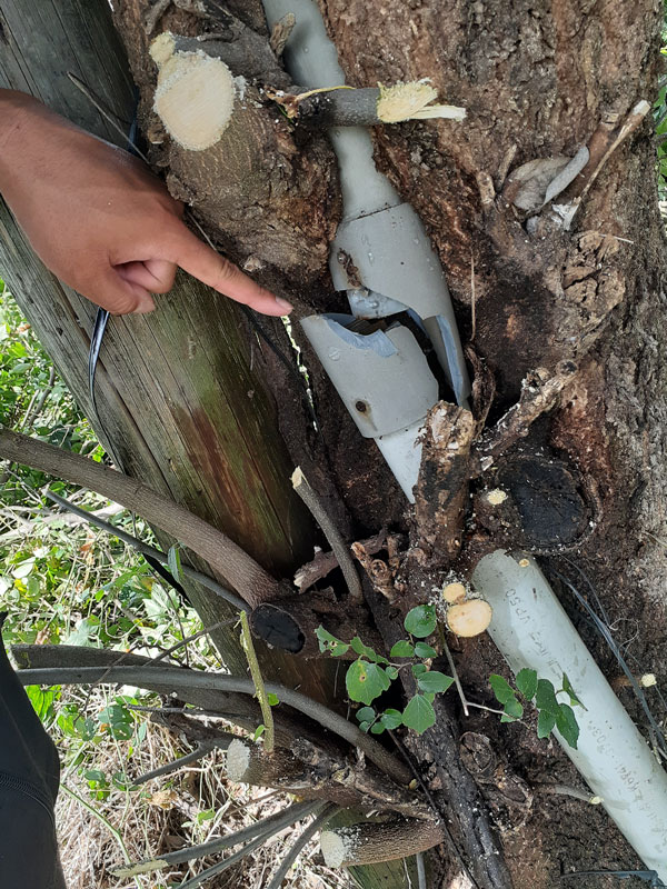 30年以上前に設置した潅水パイプが、木の成長で巻き込まれてとうとう破裂してしまいました。↓