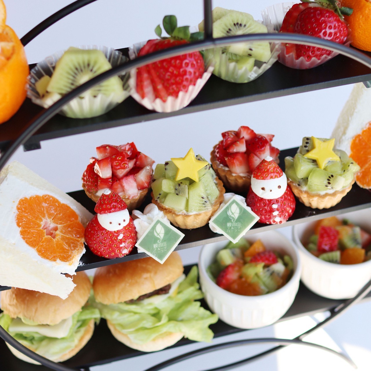 二段目へ視線を移せば、愛らしい「いちごのサンタ」や「キウイのツリータルト」が、皆様をお出迎え。